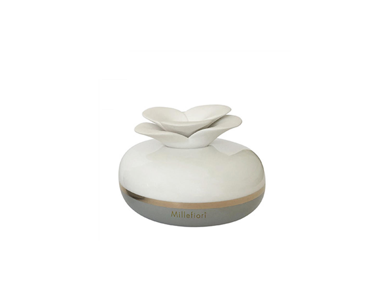 • Millefiori Flower Fragrance Diffuser er en dekorativ og funktionel diffuser i keramik fra italienske Millefiori, der bruges til at sprede en behagelig duft i ethvert rum. Diffuseren har et eksklusivt design og blomsterform, der er inspireret af den italienske tradition for glasproduktion. Blomsten er produceret i porøs sten, som absorberer refillolien og derefter spreder duften. Diffuseren er let at bruge, du skal blot fylde den med den ønskede duftende olie blandet med vand. Du kan justere intensiteten af duften ved at tilføje flere dråber olie. Du kan vælge mellem mange skønne dufte, så du finder netop din favoritduft. Udover at sprede en behagelig duft fungerer Millefiori Flower Diffuser også som en dekoration i dit hjem eller på kontoret. Den elegante blomsterform giver en unik og stilfuld touch til ethvert rum. En moderne og elegant løsning til dig, der gerne vil skabe din egen stil. Leveres uden duftolie – skal købes separat. Vi anbefaler en farveløs olie, da diffuseren absorberer oliens farve, og derfor kan blive misfarvet af farvede olier.
