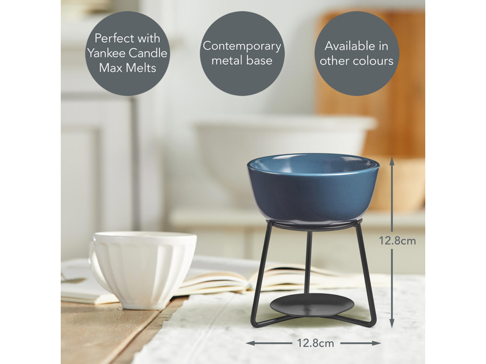 Pebble Melt Warmer har en keramisk skål med en smagfuld mat finish placeret på en stilfuld metalbund. Farven Orion Blue tilføjer et sofistikeret og moderne look, der passer ind i enhver indretning.