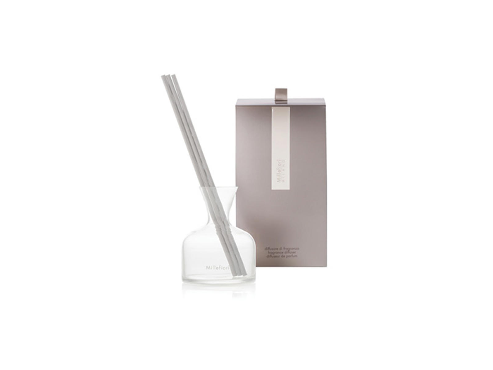 • Millefiori Vase Fragrance Diffuser White Glass er en stilfuld og elegant diffuser fra italienske Millefiori, der fungerer som både en smuk dekoration og en rumdiffuser. Diffuseren er designet i form som en vase, og er fremstillet af hvidt glas, der passer til enhver moderne indretningsstil. Diffuseren er nem at bruge, du skal blot fylde vasen med den ønskede duftende olie, og sætte de medfølgende diffuserpinde i vasen. Pindene absorberer olien og spreder duften i rummet, og du kan justere intensiteten af duften ved at tilføje eller fjerne pindene. Alle refills fra Millefiori serien kan anvendes til denne diffuser. Millefiori Vase Fragrance Diffuser Glass er tilgængelig i 3 forskellige varianter. Den elegante vaseform og den hvide farve giver et rent og klassisk look til ethvert rum.