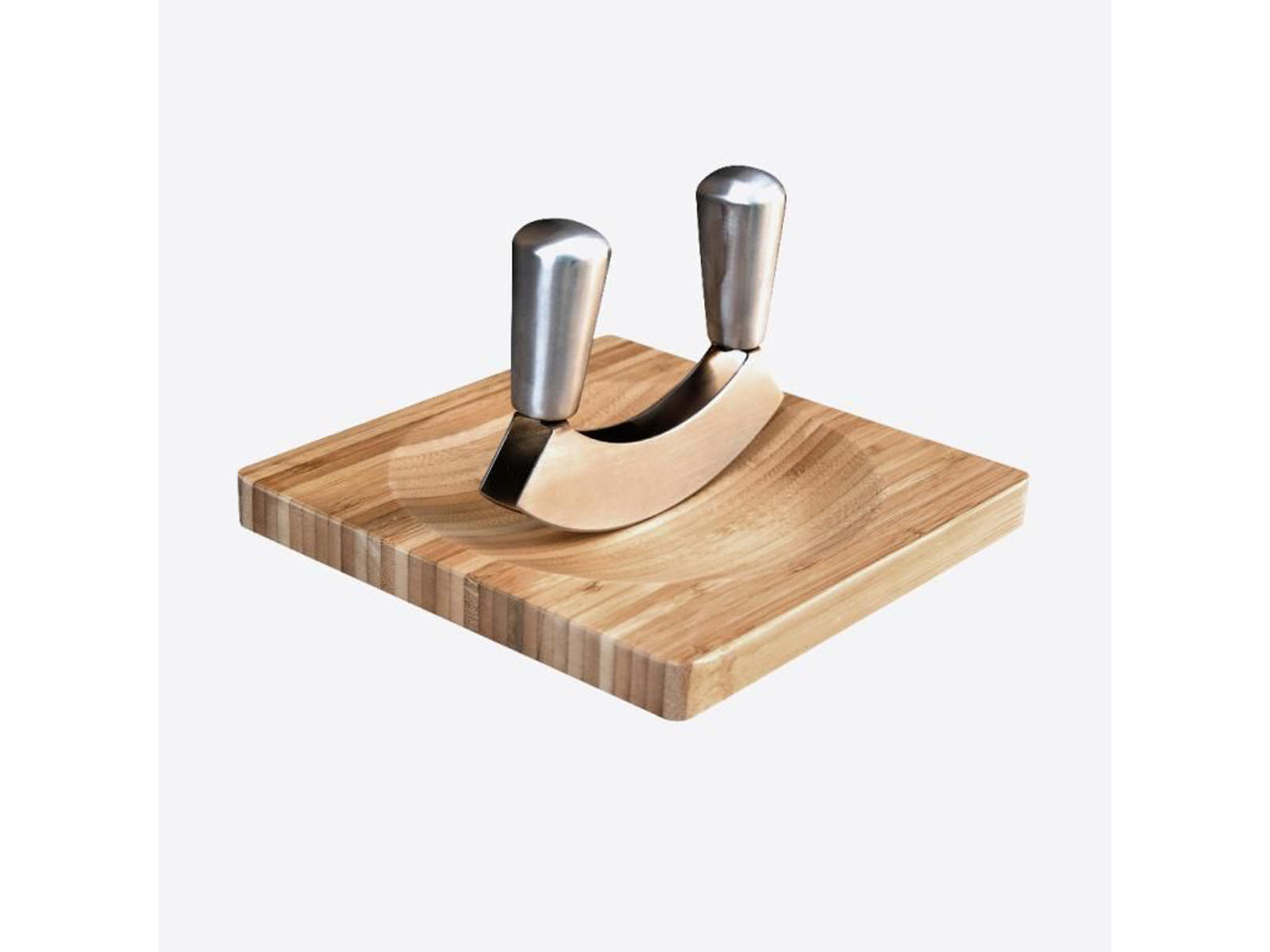 - Design: Firkantet bræt med fordybning så den buet kniv give en præcis hakning