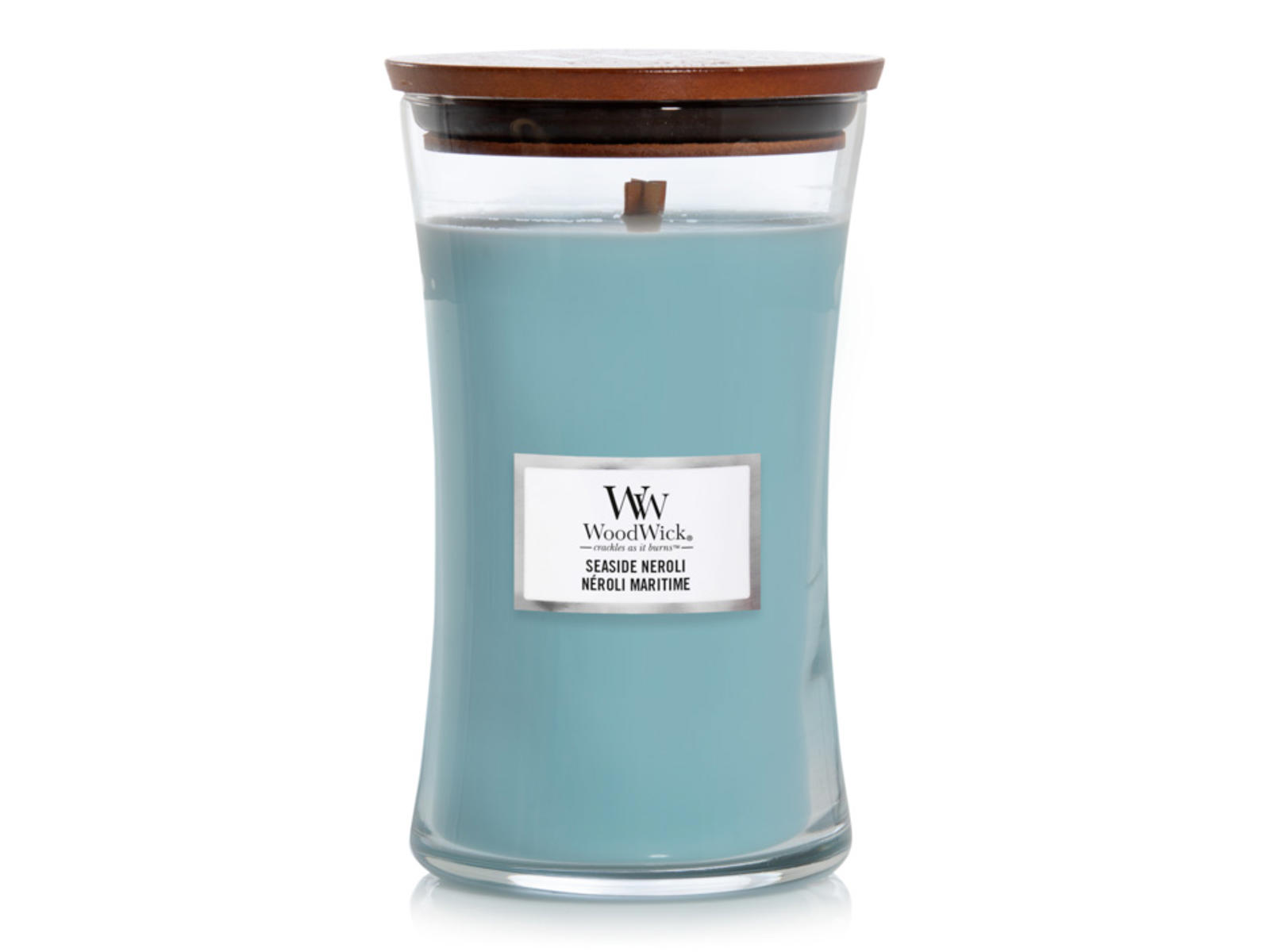 WoodWick Large Hourglass - Seaside Neroli. Som en frisk brise ved havet af drivtømmer og åkandenoter, med den sødede duft af neroliblomst og frisk mandarin.